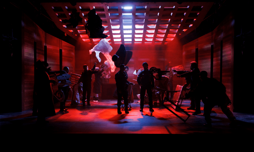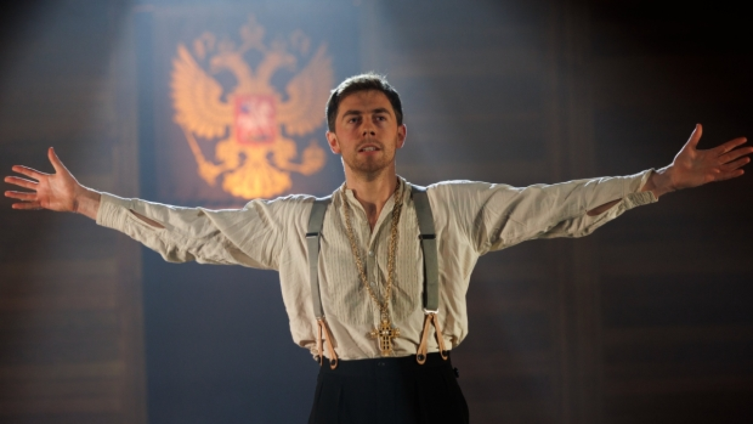 Tim Supple’s production is visually impactful. It’s an impressive set of clostraphobic exposed wood. The costuming is equally impressive. Robert Innes Hopkins’ use of modern suits and military suits modernises the political drama to Putin’s Kremlin, but the traditional robes and regalia of Russian orthodoxy anchor the visual world in tradition. The show has seemingly endless props, which are used as symbols throughout. Supple’s direction provides very clever use of space. The stage’s wooden box transforms from parliament chambers to an Orthodox Church to a particularly visual battlefiled.