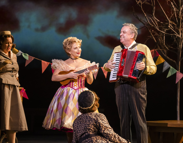 It’s a shame as the production started strong. During the overture, a grainy projector flashes vintage BBC news reels. This plants us in the post-war, early days of Queen Elizabeth II’s reign and draws parallels to familiar headlines—rail strikes and a revolving door of Parliamentary leadership. This is GIlbert-style satire at its best. Besides a few costume references, like the late Queen’s insignia on the beefeaters, the production fails to identify itself with the 1950s, Gilbert & Sullivan’s own Victorian age, or the original setting in Elizabeth I’s London. This clever point-of-view quickly fizzles out.