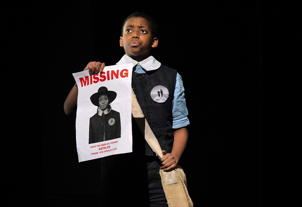 Malakai M Bayoh first walks on stage as Oberto in a Puritan-inspired school uniform and a cross-the-shoulder messenger bag. He’s cleverly holding up a “Missing” poster. His character is searching for his father whom, unbeknownst to Oberto, the enchantress Alcina has turned into a lion.